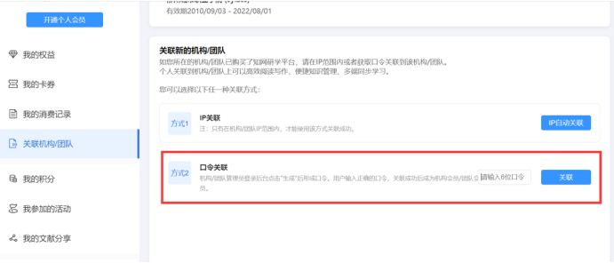 登陆成功后,点击右上角的头像,进入个人中心,点击左侧的“关联机构/团队”在方式一里,选择“口令关联”,输入口令C5NVWN,显示“KY开元集团官网入口”名称,即为成功关联。
