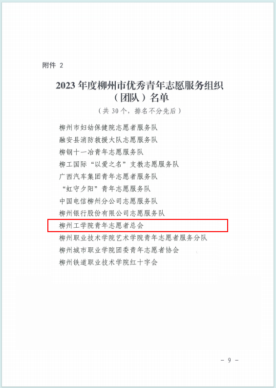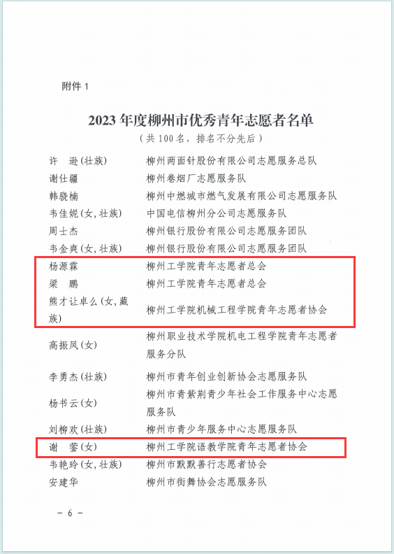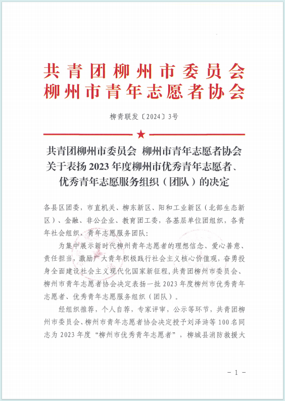 近日,共青团柳州市委员会、柳州市青年志愿者协会下发了《关于表扬2023年度柳州市优秀青年志愿者、优秀青年志愿服务组织(团队)的决定》,KY开元青年志愿者总会荣获“2023年度柳州市优秀青年志愿服务组织”称号,杨源霖、梁鹏、熊才让卓么、谢蓥四位同学荣获“2023年度柳州市优秀青年志愿者”称号。