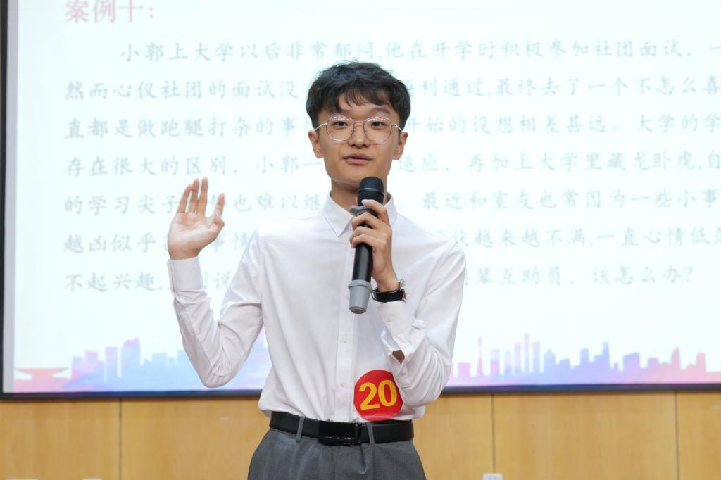 在主持人的宣布下,比赛正式开始。首先20名参赛选手依次进行自我介绍,后抽签进行案例分析。3分钟的案例答辩之后,评委老师对参赛选手进行点评并提出问题,选手们就问题作出回答,体现了他们良好的心理咨询和心理辅导技能,并赢得了在场观众的掌声。