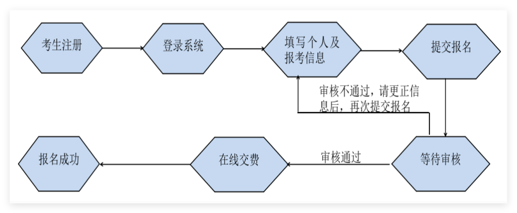 符合报名条件的考生登录“广西招生考试院”网站(https://www.gxeea.cn/下同)“系统导航→考试报名→广西高等学校教师资格考试综合管理系统”(以下简称报名系统)进行网上报名和支付考试费,逾期不安排补报名。报名流程为:注册→完善个人信息→报考→等待资格审核→缴费→报考成功。具体流程如下: