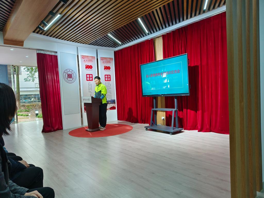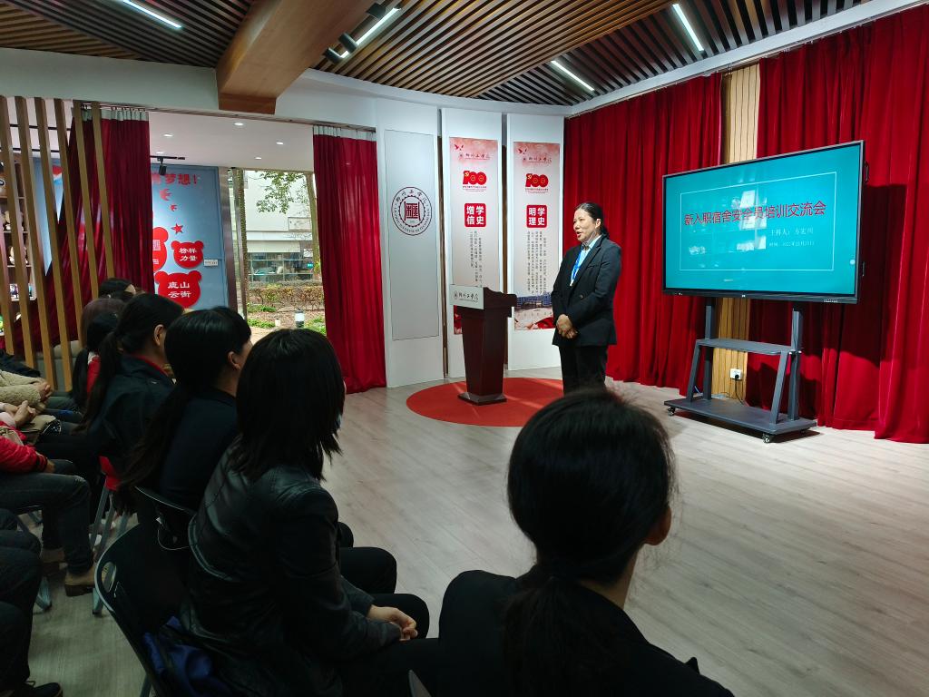 为进一步加强宿舍安全员队伍建设,切实提升新入职宿舍安全员工作能力,为学生提供更专业更优质的服务,营造安全和谐的公寓氛围。2022年11月25日下午14:10,公寓管理中心在校易班中心召开新入职宿舍安全员培训交流会,进行业务培训、优秀宿舍安全员工作经验分享及工作交流,会议由方宏川老师主持。