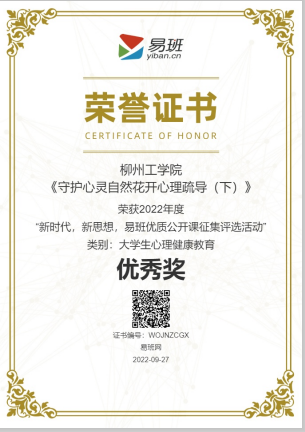 2022年9月,荣获2022年度“新时代,新思想,易班优质公开课征集评选活动”(大学生心理健康教育)优秀奖;