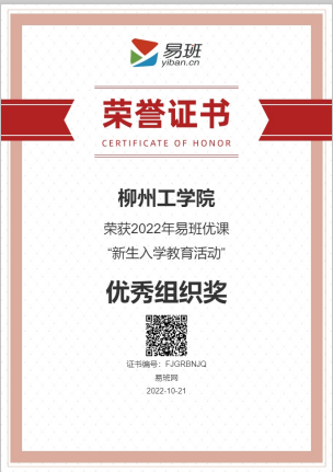 2022年10月,荣获2022年易班优课“新生入学教育活动”优秀组织奖。
