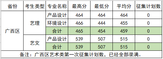 2021年广西区艺术类第一次征集完成,共11个计划,出档11人,完成率为100%;按1:1出档规则,各专业出档分数如下:
